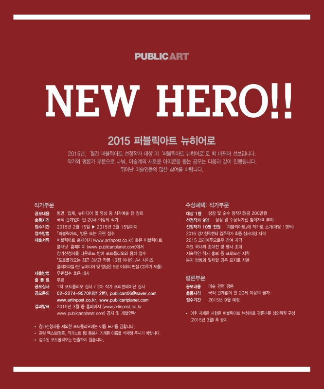2015년, ‘월간 퍼블릭아트 선정작가 대상’이 ‘퍼블릭아트 뉴히어로’로 확 바뀌어 선보입니다. 작가와 평론가 부문으로 나눠, 미술계의 새로운 아이콘을 뽑는 공모는 다음과 같이 진행됩니다. 뛰어난 미술인들의 많은 참여를 바랍니다.