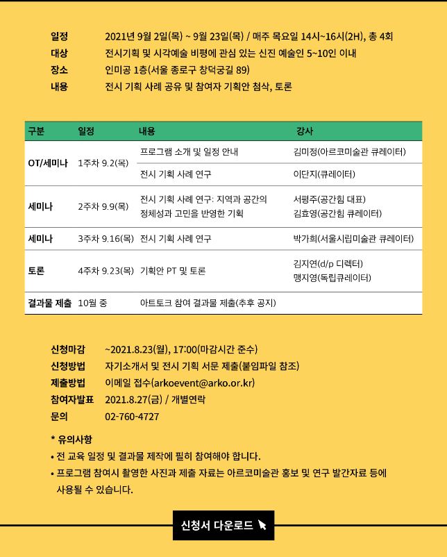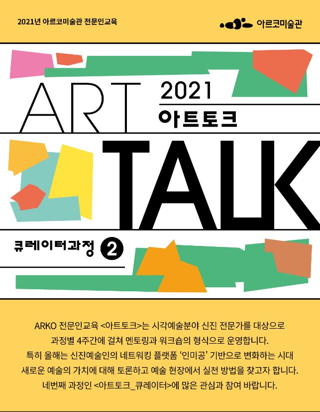 2021년 아르코미술관 전문인 교육 <아트토크_큐레이터 과정(2)>은 전시기획 및 시각예술 비평에 관심있는 신진 예술인을 대상으로 9월 2일(목)부터 종로구 원서동 '인미공'에서 진행됩니다.