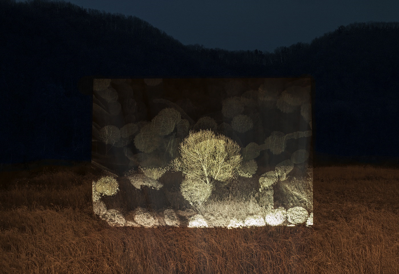지호준 작가는 궁극적으로 보는 행위에 대한 새로운 차원의 사고를 이끌어내기 위해 사진예술의 진보된 패러다임으로 인정받는 ‘나노그래피 Nanography’ (Nano와 Photography의 합성어) 연작들을 선보이고 있다. 전자현미경으로 나노미터단위까지 확대 촬영하여 얻은 한지 이미지를 컴퓨터로 편집하고 채색작업을 거친 후, 건물이나 대자연과 같은 실제공간에서 투사하여 재촬영하는 방식을 취한다. 확대시킨 한지는 물줄기 같은 곡선이나 나무줄기처럼 보이는 직선, 그리고 수많은 점들로 이루어져 그야말로 종이 한 장에 자연 그대로를 펼쳐 놓고 있다. 홀로그램 혹은 증강현실을 연상시키는 작품은 현실과 가상의 경계를 넘나들며 몽환적인 분위기를 자아낸다. 우리가 흔히 아는 자연의 모습과 육안으로는 볼 수 없는 미지의 영역을 재구성한 자연의 모습을 한 프레임 안에서 볼 수 있는 창의적이고도 탁월한 작업이다.