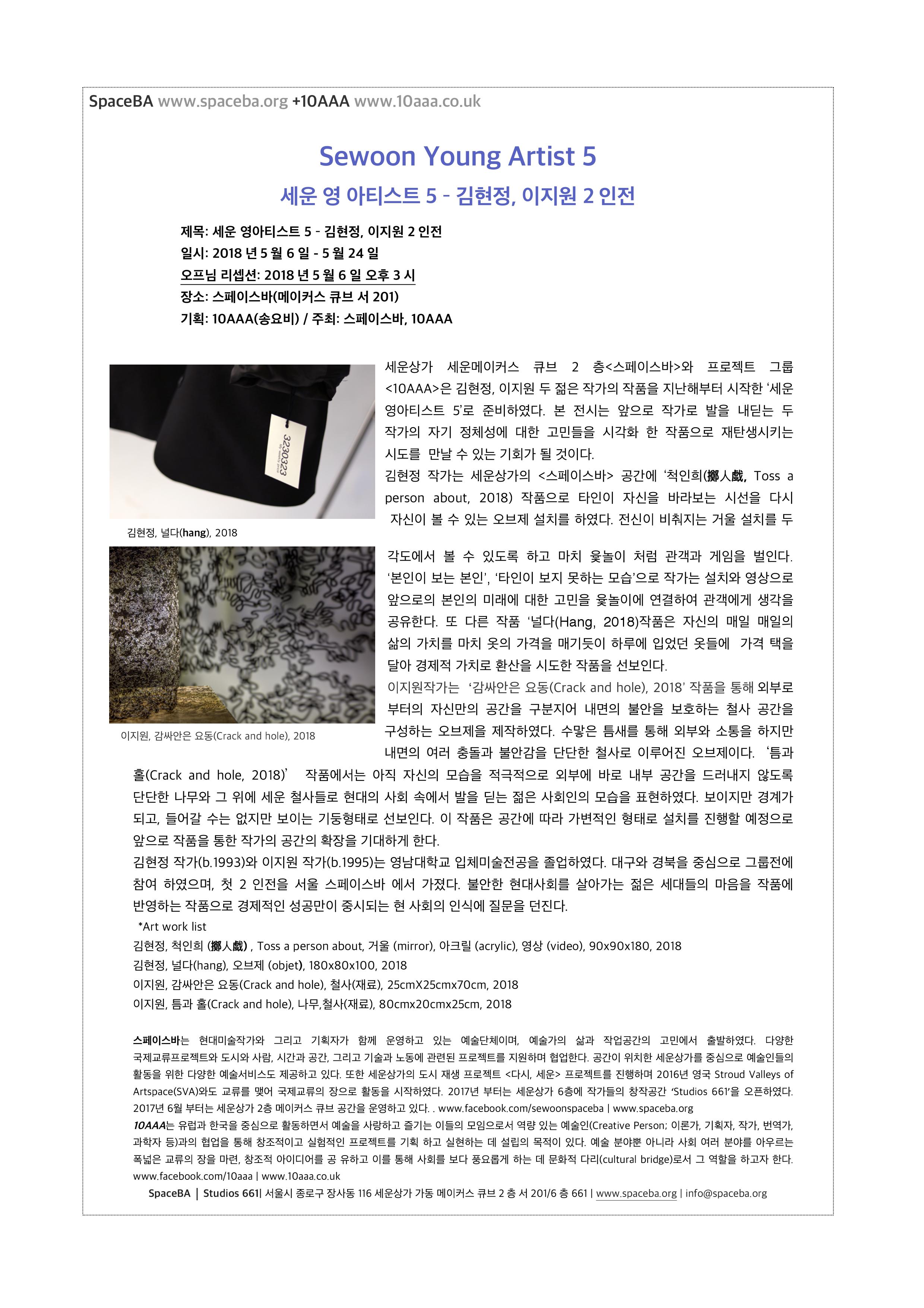 Sewoon Young Artist 5 – 김현정, 이지원 2인전 페이지 정보 작성자 스페이스바 조회 11,540회 작성일 18-05-11 11:57 작가 김현정, 이지원 기간 2018-05-06 - 2018-05-24 장소 세운상가 메이커스큐브 서 201호 홈페이지 http://www.spaceba.org 좋아요 0 공유하기 . SNS공유 목록 이전글 [아트스페이스 와트 신진작가전] 우리가 알고 있다고 생각했던 것들의 변형, 구두 수선비는 구ː두(口頭)로 대신합니다 18.05.12 다음글 [갤러리누리]2018 고양아티스트 365 Solo 윤정례 작가 18.03.05 스페이스바님의 기획 및 단체전 관련글 기획 및 단체전 더보기 H 인기글 JUST(1. 딱[꼭] 2. 그저, 단지) 01-26 H 인기글 메타버스 ‘용인’Ⅱ - <미디어 자화상 : 나와 또 다… 01-15 H 인기글 [스페이스바]식물원(飾物園)프로젝트_13.5℃:이다현,… 06-01 H 인기글 「홀씨프로젝트(Spore Project)」 12-15 H 인기글 [스페이스바]“도시도감 : 도시생물” _ R3028 12-15 H 인기글 세운의 얼굴/ SEWOON PORTRAIT 12-03 H 인기글 반짝반짝 세운상가_미래예술연구소 01-12