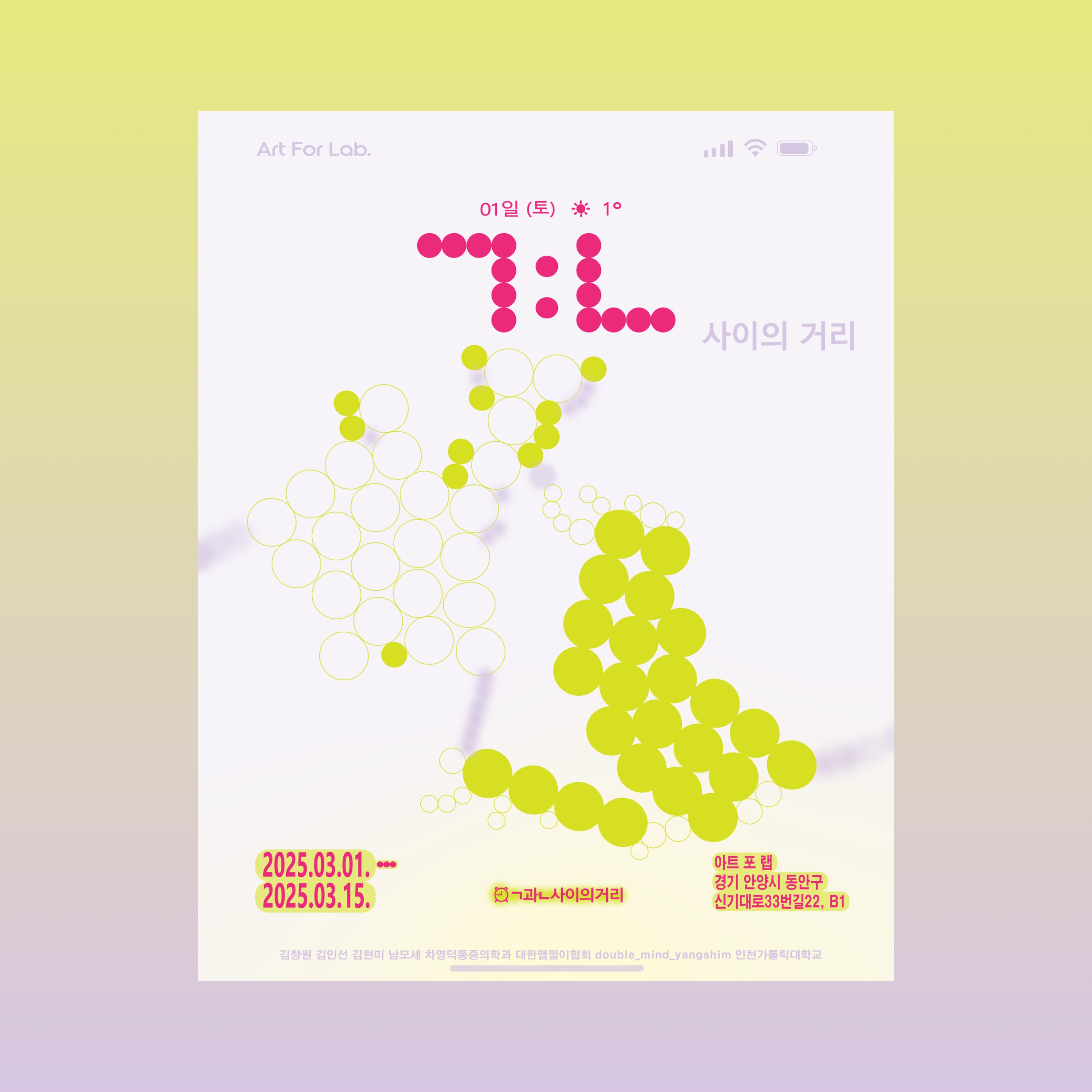 이 전시는 인천가톨릭대학교와 아트 포 랩, 참여 작가들, 그리고 후원자들의 협력으로 만들어졌다. 하지만 이는 단순한 학교 프로젝트의 경계를 넘어, 예술계와 사회를 잇는 의미 있는 시도이며, 그 진정한 완성은 관객 여러분의 참여에 달려있다. 작품과 관객 사이의 열린 대화를 통해, 예술은 끊임없이 새로운 의미를 만들어낼 것이다. 예술의 자유로움으로 더욱 풍요로워질 우리 사회의 모든 구성원들에게 깊은 감사를 전한다.