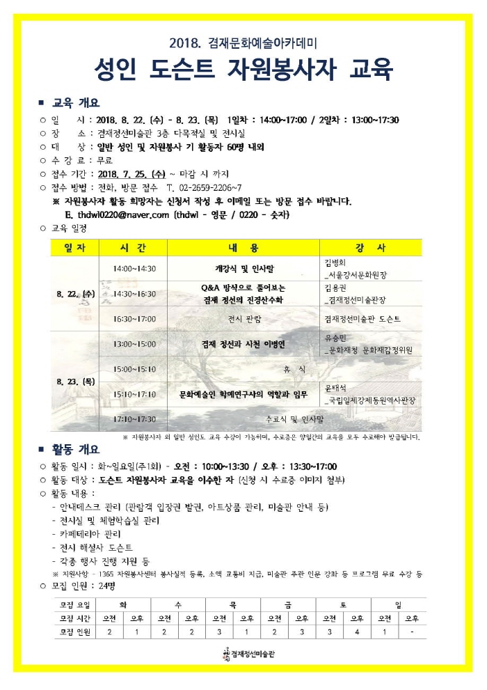 [겸재정선미술관] 2018. 성인 도슨트 자원봉사자 교육 페이지 정보 작성자 장희선 댓글 0건 조회 10,625회 작성일 18-07-07 13:34 본문 ※ 자세한 사항은 미술관 홈페이지 공지사항(http://gjjs.or.kr) 확인 바라며, 많은 참여 부탁드립니다. 감사합니다. 추천 0 목록 이전글 [겸재정선미술관] 제7기 학생 도슨트 교육 18.07.07 다음글 [송은 아트스페이스] 도슨트 자원봉사자 모집 “전소정 : Kiss Me Quick” 17.04.26 장희선님의 인턴정보 관련글 인턴정보 더보기 H 인기글 [겸재정선미술관] 제7기 학생 도슨트 교육 07-07