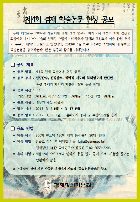 [겸재정선기념관] 제4회 겸재 학술논문 현상 공모 페이지 정보 작성자 장희선 조회 7,442회 작성일 12-08-30 11:26 본문 많은 관심과 참여 부탁드립니다 추천 0 목록 이전글 EDA GALLERY에서 2012 신진작가를 모집합니다. 12.10.10 다음글 [겸재정선기념관] 제3회 내일의 작가 공모 안내문 12.08.24 장희선님의 알림마당 관련글 알림마당 더보기 H 인기글 [겸재정선미술관] 2019. 제10회 겸재 내일의 작가… 07-12 H 인기글 [겸재정선미술관] 2019. 제10회 겸재 내일의 작가… 07-11 H 인기글 [겸재정선미술관] 제7기 학생 도슨트 교육 07-11 H 인기글 [겸재정선미술관] 2018. 성인 도슨트 자원봉사자 교… 07-11 H 인기글 [겸재정선미술관] 제2기 겸재 홍보 서포터즈 활동단 모… 12-06 H 인기글 [겸재정선기념관] 제10회 겸재사생대회(5.24일) 05-09 H 인기글 [겸재정선기념관] 제 4회 겸재 학술논문 현상 공모 02-13 H 인기글 [겸재정선기념관] 제3회 내일의 작가 공모 안내문 08-24