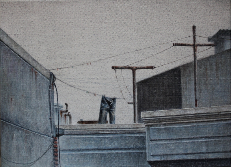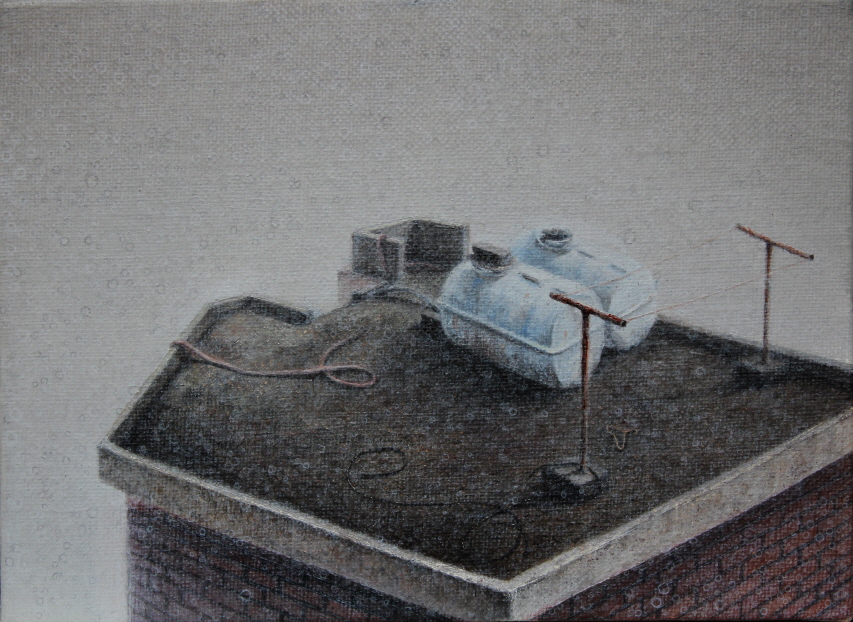 김해진은 많은 사람이 큰 세상 속에 살기 때문에 우리 가까이 있는 옥상이라는 작은 공간을 잊고 살아가는 것에 대한 안타까움과 어떻게 보면 옥상이라는 작은 공간이 자신과도 닮아 있다고 생각하며 옥상을 그린다. 개인적인 경험과 상상으로 작품을 만드는 김해진은 우리가 흔히 지나다니는 골목의 옥상에 화분, 에어컨, 빨래건조대 등을 그리고 무언가 비어있는 듯한 상상의 공간으로서의 옥상을 재현해낸다. 회색톤으로 그려진 건물옥상은 쓸쓸하면서도 아련한 추억을 불러일으킨다. 이러한 그의 작품 속 풍경들을 마주하고 있으면 아쉬움과 함께 지난 그리움이 파도처럼 밀려온다. 김해진은 옥상에서 바라보는 풍경이 아니라 옥상 자체를 그리고 있다. 그에게 옥상은 시선으로 세상을 바라보는 장소가 아닌 시선이 시작되는 장소이다. 그러나 그 시선은 어느 곳으로도 나아가지 못한 채 옥상 그 자체에 머물러 있다. 옥상 밖으로 전개되는 풍경에 대한 예시나 시선의 이동조차 허용하지 않는다는 점에서 그의 옥상은 진부한 감상을 거절하며, 그 텅 빈 옥상 속에 감상자 자신의 이야기를 담을 수 있게 만든다.