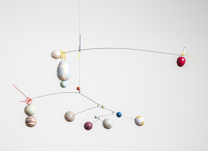 ‘잇은’의 작품은 네모난 캔버스의 틀을 벗어나 있다. 다양한 구조의 틀을 바탕으로 점, 선, 면과 같은 도형의 기본 요소들이 교차하여 배치되고 틀 밖으로 예민하게 뻗어있기도 하면서, 평면적, 입체적 요소들이 상응하며 새로운 조형미를 드러낸다. 또한 이번 전시에서 새롭게 선보이는 모빌은 가느다란 와이어에 매달린 오브제들이 미묘한 균형을 이루며 공간적, 시간적 요소를 동시에 경험하게 한다. 작품의 와이어와 우드볼을 따라 시선을 옮기다 보면, 눈길을 사로잡는 ‘잇은’ 특유의 섬세한 디테일을 발견하는 즐거움을 느낄 수 있다.